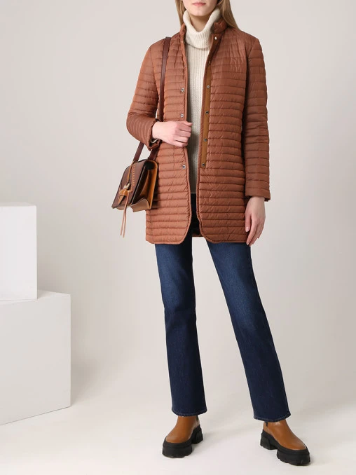 -Коричневый стеганый пуховик от MOORER. -Приталенный крой, длинные рукава, воротник-стойка, застежка на кнопки. -Узкая горизонтальная стежка, благодаря которой наполнитель равномерно распределен внутри изделия и лучше сохраняет тепло.