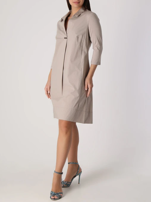 • -Бежевое мини-платье из хлопка от PESERICO. -Модель приталенного кроя с юбкой А-силуэта, укороченными рукавами длины 3/4, V-образным вырезом на груди и отложным воротником.