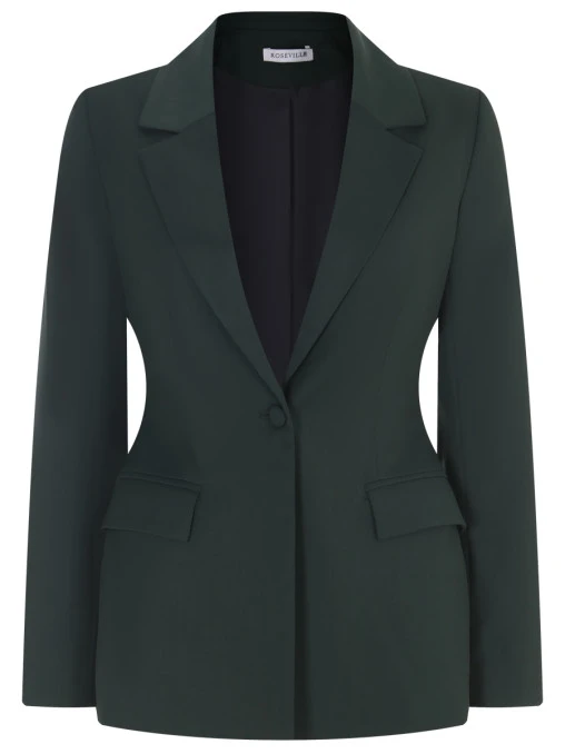 • -Темно-зеленый пиджак из шерсти от ROSEVILLE. -Модель приталенного кроя с длинными рукавами, прорезными карманами с клапанами, лацканами и отложным воротником, застежкой на одну пуговицу и шлицей сзади. -Оригинальную ноту в классический стиль вносит галстук в тон, который уместен как в офисе, так и вне.