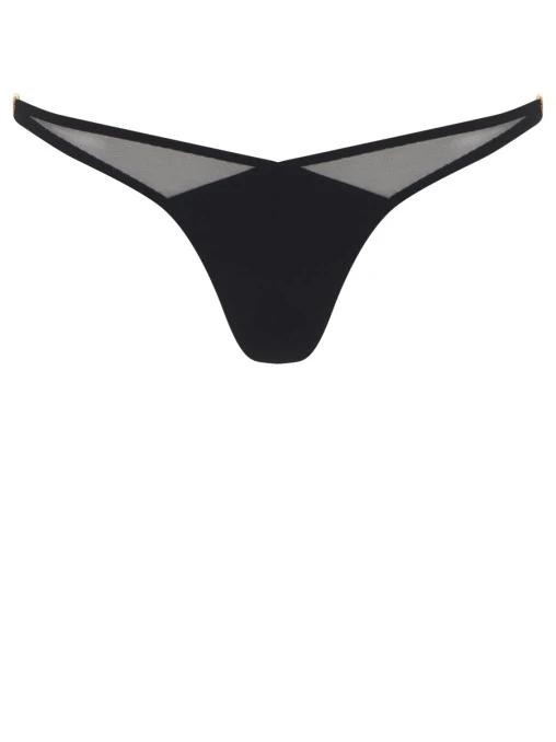 -Черные трусы-стринг из тонкой сетки купажированного состава от BORDELLE. -Модель с низкой посадкой и декоративными золотистыми кольцами на поясе, которые покрыты 24-каратным золотом. Данный товар обмену и возврату не подлежит, доставка осуществляется при условии предварительной оплаты картой.