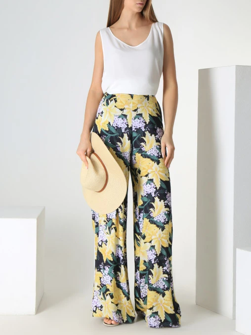 • -Брюки из легкой вискозы с цветочным принтом от INSHADE. -Модель прямого кроя с высокой посадкой на талии, классическим поясом, прорезными карманами и застежкой на молнию. -Белый топ станет отличным компаньоном для брюк, даст раскрыться яркому принту и не будет перегружать образ.