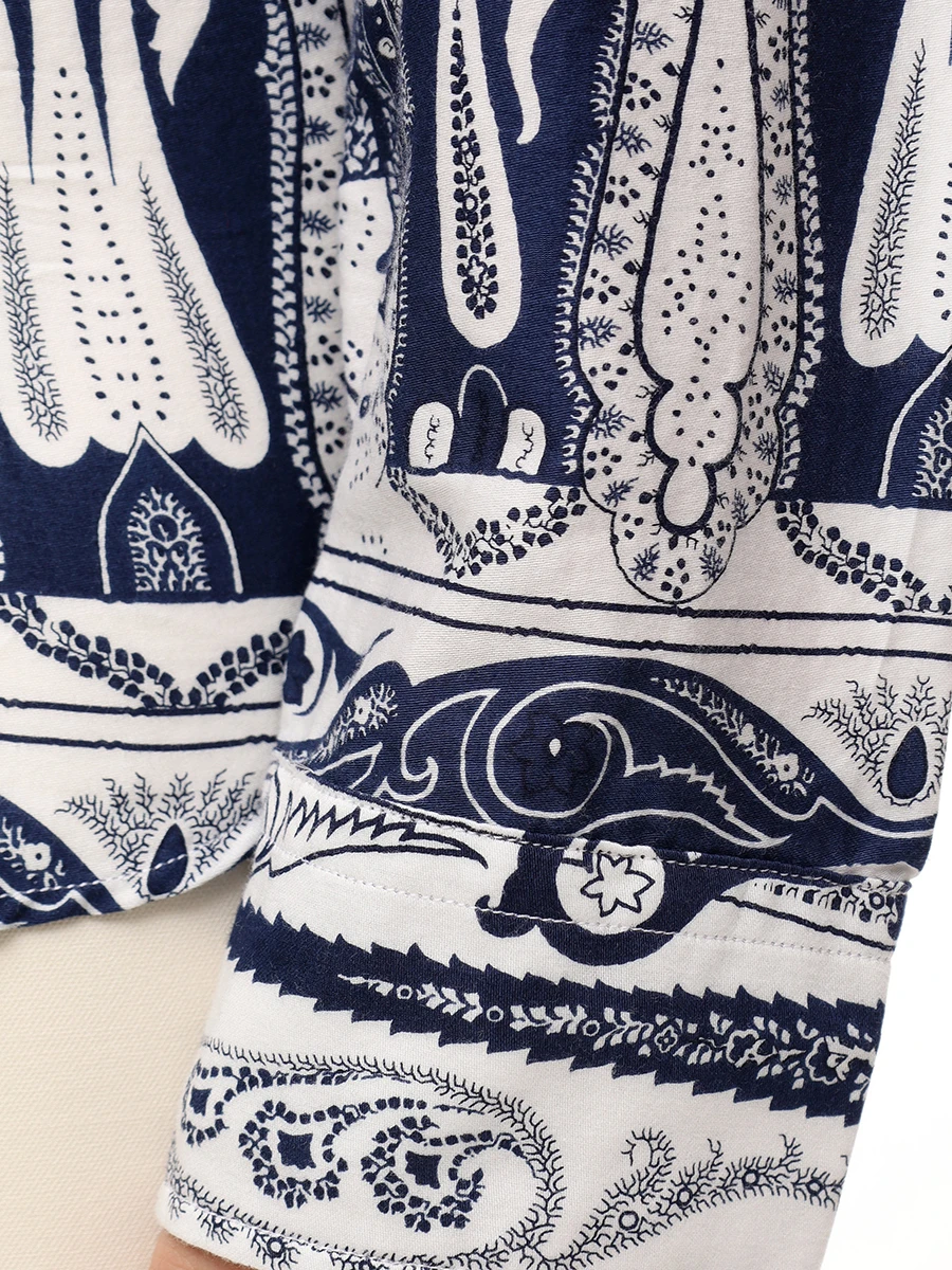 • -Рубашка из мягкого хлопка с принтом пейсли от ETRO. -Модель полуприлегающего силуэта с длинными рукавами с манжетами, отложным воротником и застежкой на пуговицы. -Рубашка станет основой повседневного образа с брюками или джинсами.