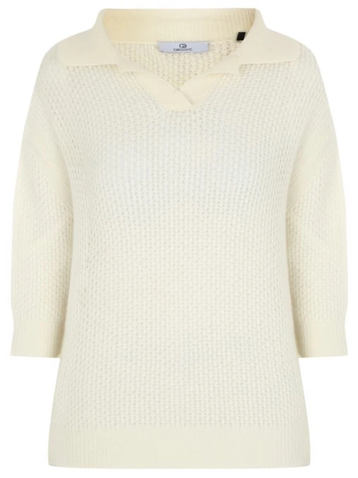 -Вязаный джемпер из кашемира молочного оттенка от ORGANIC. -Модель свободного силуэта с вывязанным сквозным узором, спущенной линией плеча, рукавами длины 1/2, рельефными манжетами и поясом, V-образным вырезом горловины и отложным воротником. -Стилизованная под поло модель дополнит удобные трикотажные комплекты на повседневную носку или менее расслабленные образы с узкими чёрными или в тон брюками.