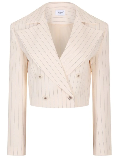 • -Бежевый в полоску жакет из вискозы от JULI TOO. -Двубортная модель свободного кроя с длинными рукавами, широкими лацканами и отложным воротником, застежкой на пуговицы. -Жакет дополнит комплект с парными шортами из коллекции бренда.