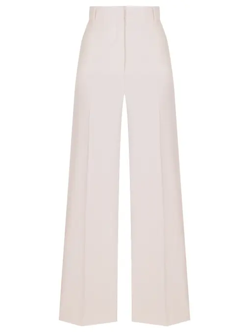 • -Кремовые брюки купажированного состава от ANTONELLI. -Модель свободного кроя с высокой посадкой на талии, которую подчеркивает пояс со шлевками, прорезными карманами, застежкой на молнию, графичными стрелками, которые визуально вытягивают силуэт.