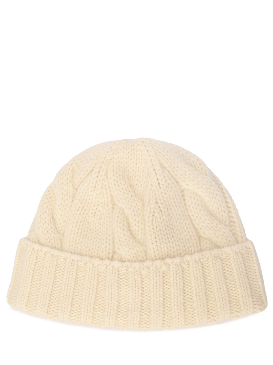 • -Белая шапка из сверхмягкого baby-кашемира Coarsehair® от LORO PIANA. -Модель-бини с фактурной вязкой косицами и широкой рельефной манжетой-отворотом, которая надежно фиксирует шапку на голове и не передавливает кожу. -Головной убор отлично впишется в повседневный образ и подарит тепло и настоящее ощущение комфорта холодной зимой.