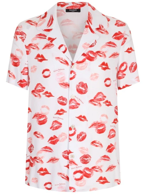 • -Белая с принтом рубашка из вискозы от BALMAIN. -Модель с кроем по фигуре, короткими рукавами, лацканами и отложным воротником, застежкой на пуговицы.