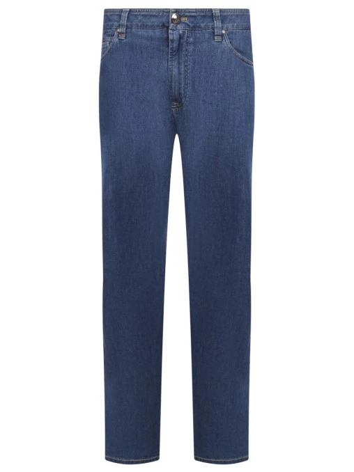 • -Голубые джинсы из смесового хлопка от CORTIGIANI. -Модель полуприлегающего кроя со средней посадкой, поясом со шлевками, прорезными и накладными карманами, застежкой на молнию и пуговицу. -Пояс декорирован нашивкой в тон с логотипом бренда.