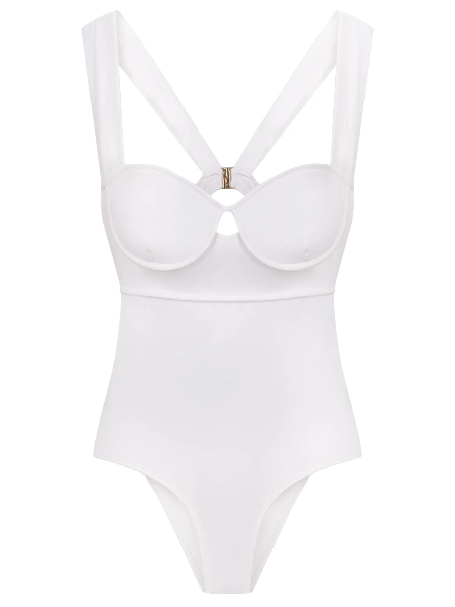 • -Белый слитный купальник купажированного состава от OYE. -Модель облегающего кроя с широкими бретелями на плечах, очерченными чашками лифа, застежкой на спине. -Полотно, сотканное из смеси полиамида и эластана, не вытягивается, быстро высыхает и не выгорает на солнце, а также устойчиво к агрессивной хлорированной и соленой морской воде. Данный товар обмену и возврату не подлежит, доставка осуществляется при условии предварительной оплаты картой.