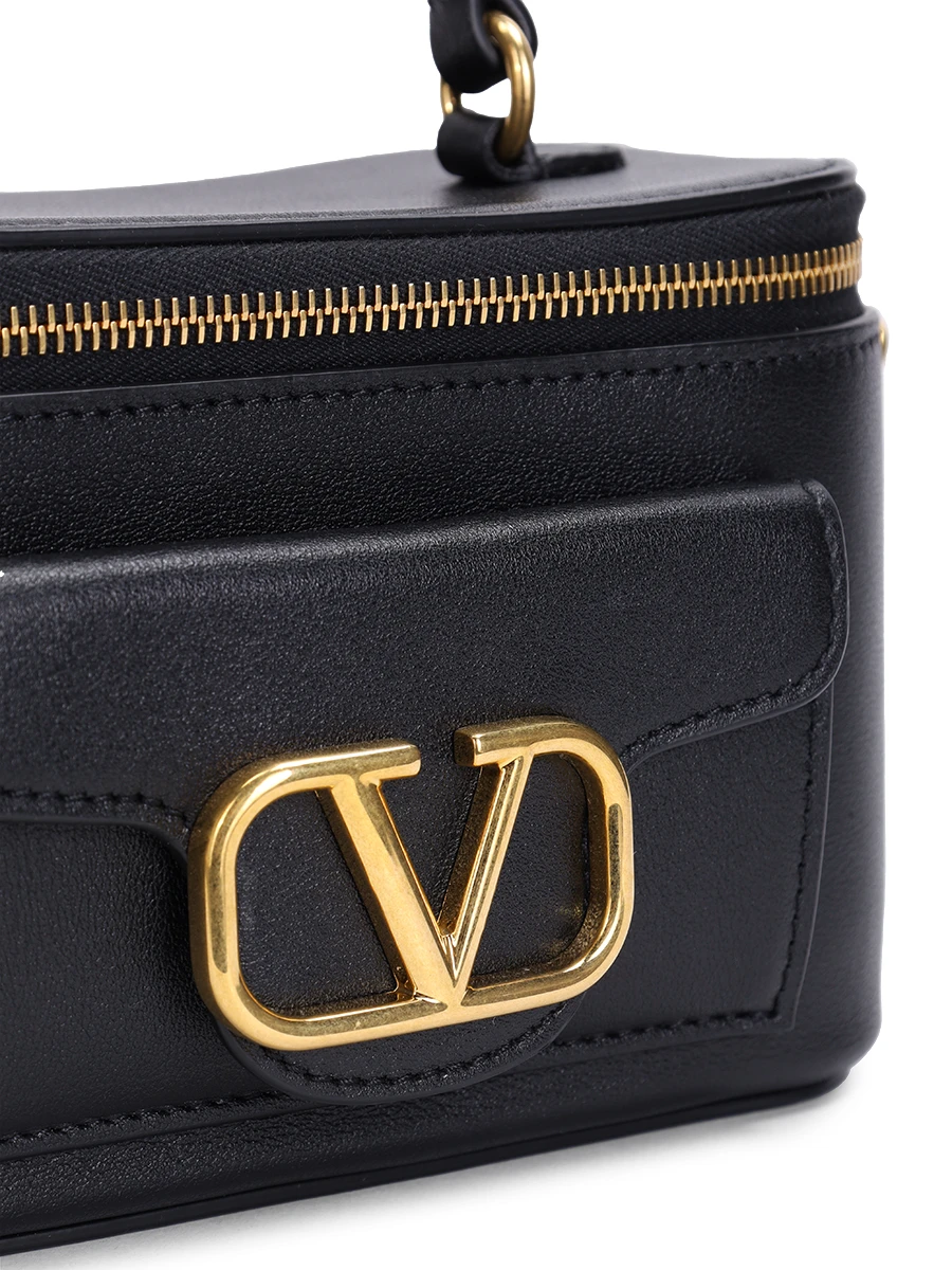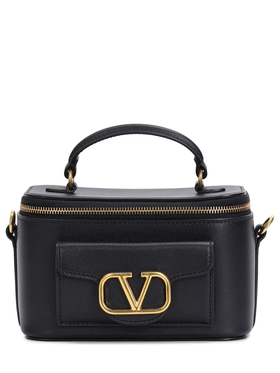 • -Черная сумка-косметичка из кожи от VALENTINO. -Модель с верхней ручкой для носки, съемным регулируемым плечевым ремнем из кожи, застежкой-молнией с двумя пуллерами, внешним накладным карманом с клапаном и магнитной застежкой. -Сумку можно носить с повседневными нарядами, а также дополнить вечерние и коктейльные образы.