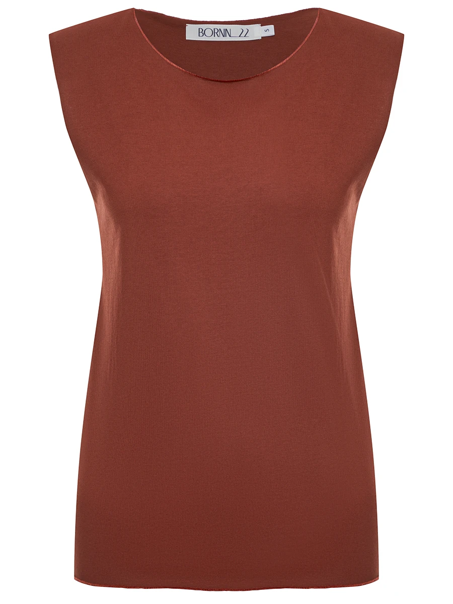 -Коричневая футболка из мягкого хлопка от BORNIN_22. -Модель полуприлегающего силуэта с круглым вырезом горловины и акцентными плечами. -Футболка станет базой как для спортивных образов, так и для повседневных аутфитов с джинсами, шортами или брюками.