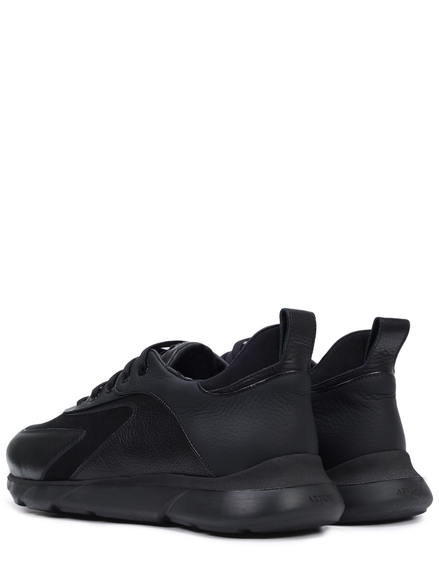 -Черные кроссовки из натуральной кожи и замши от ARTIOLI. -Модель с прорезиненным мысом, функциональной шнуровкой, легкой подошвой, логотипами бренда на язычках и пятках, внутренней отделкой из натуральной кожи.