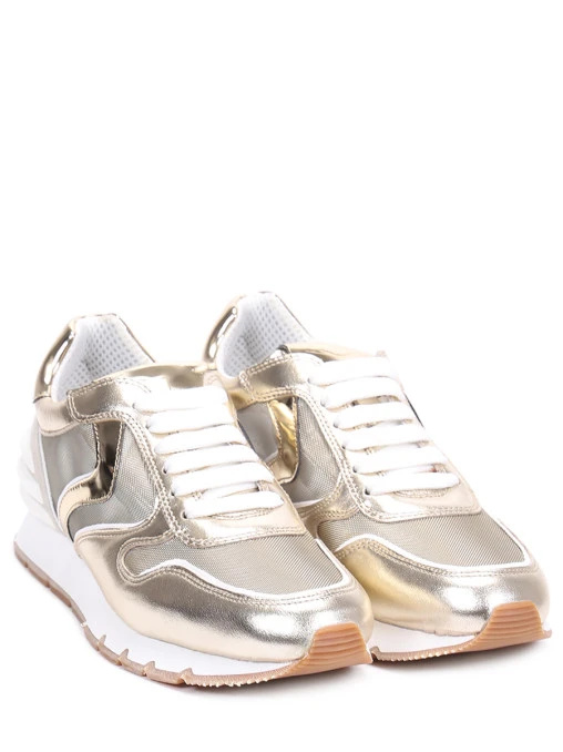 • -Золотистые комбинированные кроссовки из кожи и текстиля от VOILE BLANCHE. -Классическая форма, закругленный прорезиненный носок, толстая резиновая подошва с протектором, функциональная шнуровка, логотип на заднике и декор объемными накладками. -Сетчатые вставки без подклада, благодаря чему ноге будет комфортно в течение длительной носки.